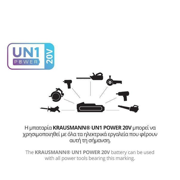 - Η μπαταρία KRAUSMANN® UN1 POWER 20V μπορεί να χρησιμοποιηθεί με όλα τα εργαλεία μπαταρίας 20V που φέρουν αυτή τη σήμανση.