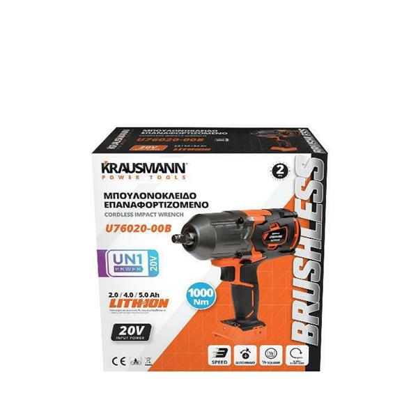 Μπουλονόκλειδο από τον κατασκευαστή Krausmann, με λειτουργία μπαταρίας 20V (δεν περιλαμβάνεται). Χρησιμοποιείται για εύκολο και γρήγορο βίδωμα ή ξεβίδωμα μπουλονιών και βιδών. Έχει δυνατότητα προσαρμογής της ταχύτητας έως 1800rpm, ώστε να τη ρυθμίζετε ανάλογα με την εργασία που έχετε να κάνετε, και κινητήρα τεχνολογίας brushless που ενισχύει την αντοχή και την διάρκεια λειτουργίας του εργαλείου. Ενδείκνυται για επαγγελματική χρήση, καθώς η ροπή του μπορεί να φτάσει έως 1000Nm. Διαθέτει ενσωματωμένο φωτάκι για διευκόλυνση της εργασίας σε δυσπρόσιτα και σκοτεινά σημεία.