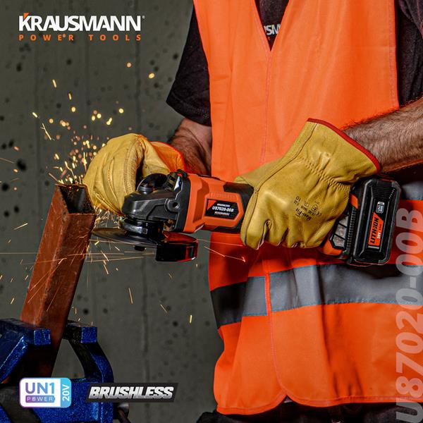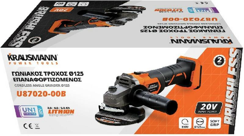 Γωνιακός τροχός της εταιρείας Krausmann, με λειτουργία μπαταρίας 20V (δεν περιλαμβάνεται). Δέχεται δίσκους με διάμετρο έως και 125mm, έτσι καλύπτει ικανοποιητικά τις περισσότερες ερασιτεχνικές και επαγγελματικές εργασίες καθώς μπορεί να κόψει σε βάθος έως 4 εκατοστά. Τέλος, διαθέτει νέας τεχνολογίας κινητήρα χωρίς ψύκτρες, που προσφέρει μεγαλύτερη αυτονομία, διάρκεια ζωής και μειώνονται οι ανάγκες συντήρησης αλλά και οι προμήθειες ανταλλακτικών. Ο δίσκος δεν περιλαμβάνεται.